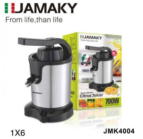 عصارة مكبس للحمضيات والرمان ماركة JAMAKY الفخامة بامتياز ايطالي هيكل ستانلس مقاوم للصدأ والكسر مع مقبض مصنوع من الألمنيوم استطاعة المحرك 700 واط { فعليّة } ما عليكي غير تضغطي بالمكبس الجسم المدور بيتحرك تلقائياً نتيجة الضغط ليصير عصيرك جاهز بثواني